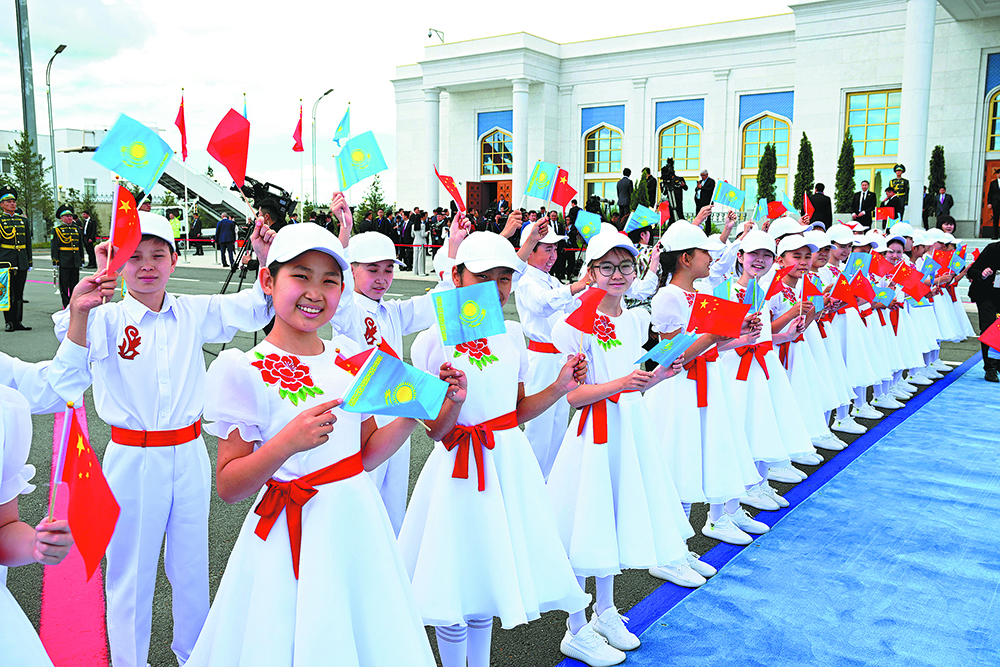 Children wave Chinese and Kazakh national flags at the welcoming ceremony at the airport in Astana on Tuesday. XIE HUANCHI/XINHUA
