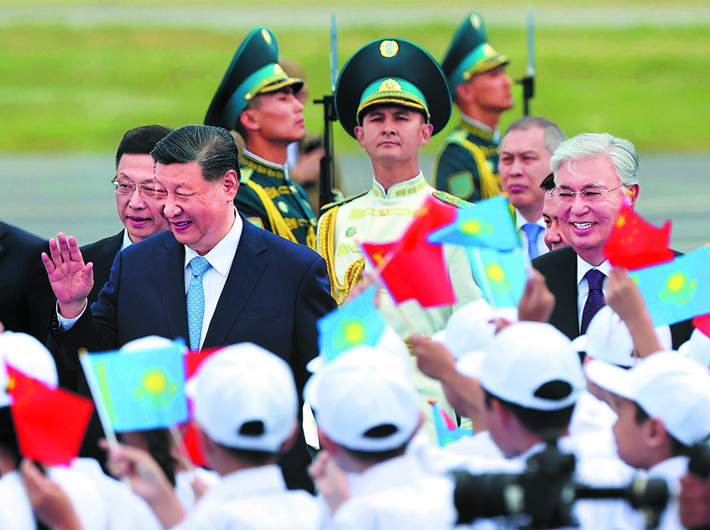 President Xi Jinping (center) reviews the honor guard, accompanied by Kazakh President Kassym-Jomart Tokayev, during a welcoming ceremony at the presidential palace in Astana on Wednesday. YUE YUEWEI/XINHUA