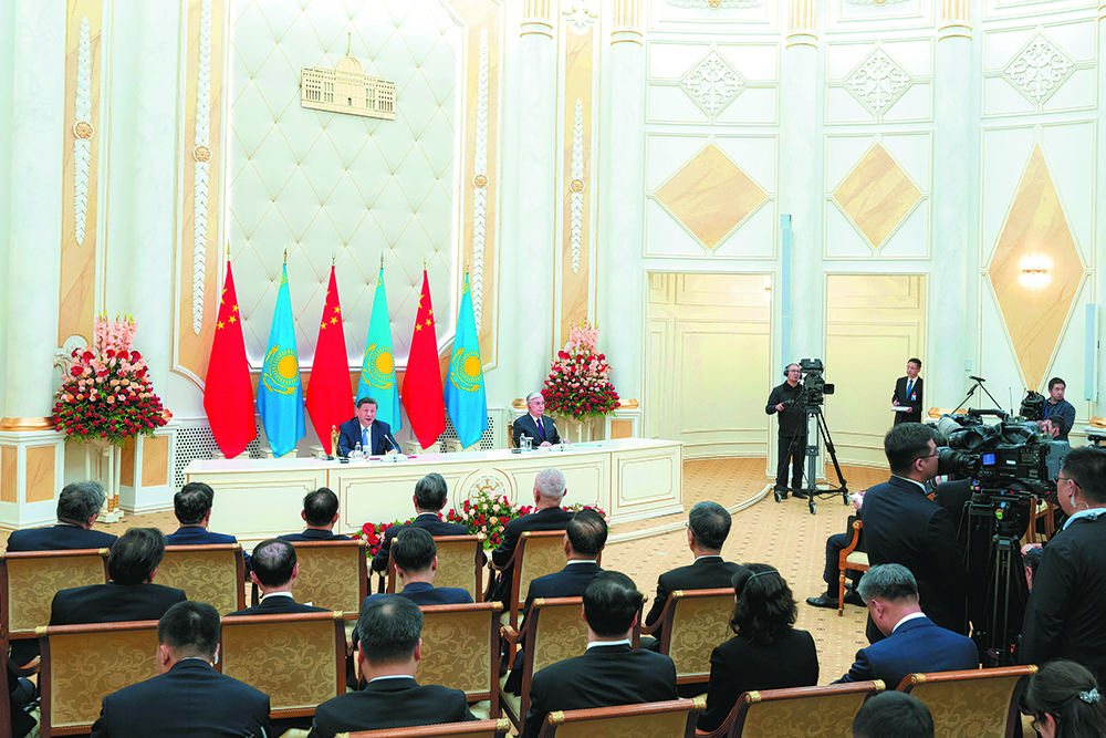 President Xi and Kazakh President Tokayev meet the media after their talks at the presidential palace in Astana on Wednesday. ZHAI JIANLAN/XINHUA