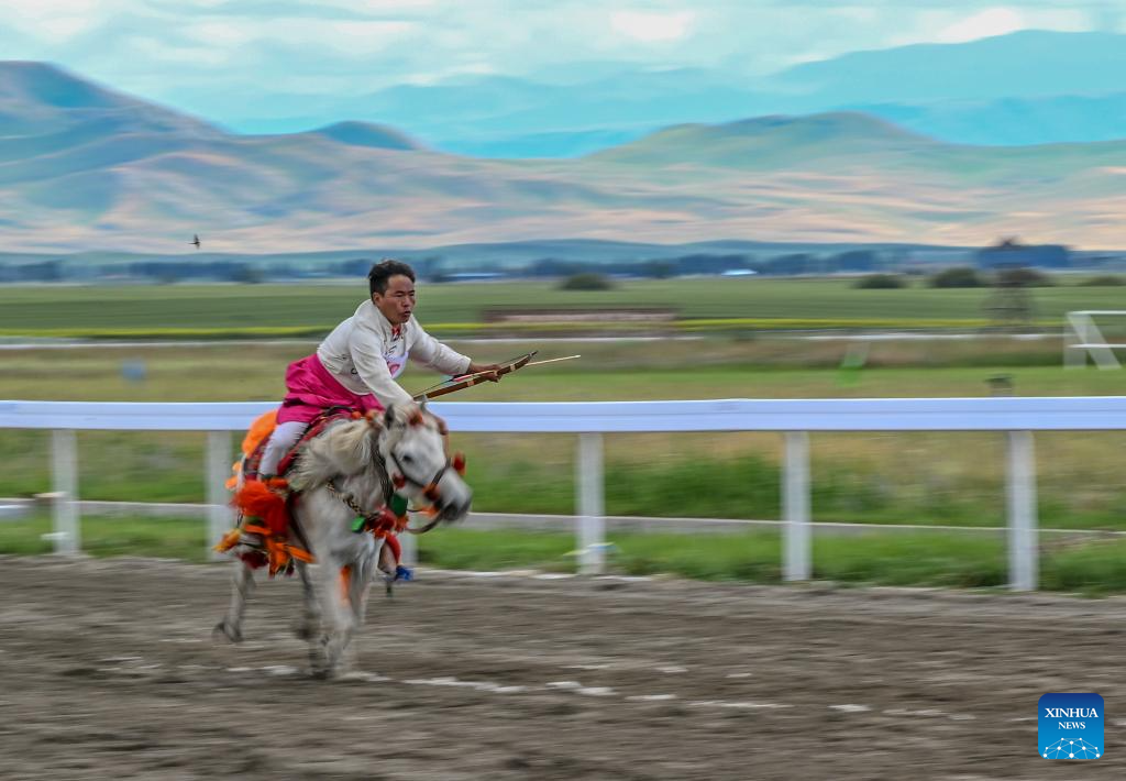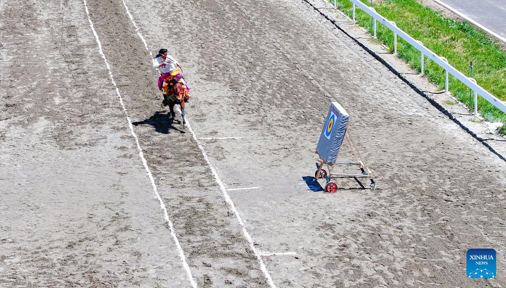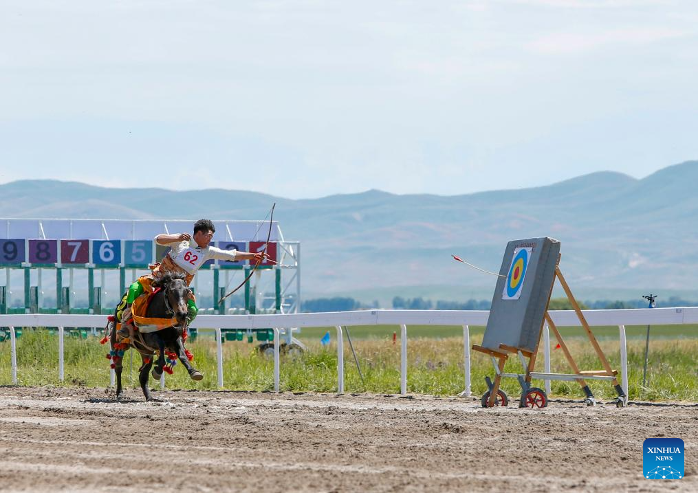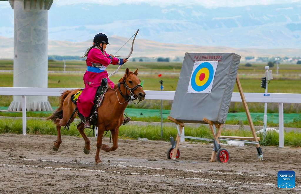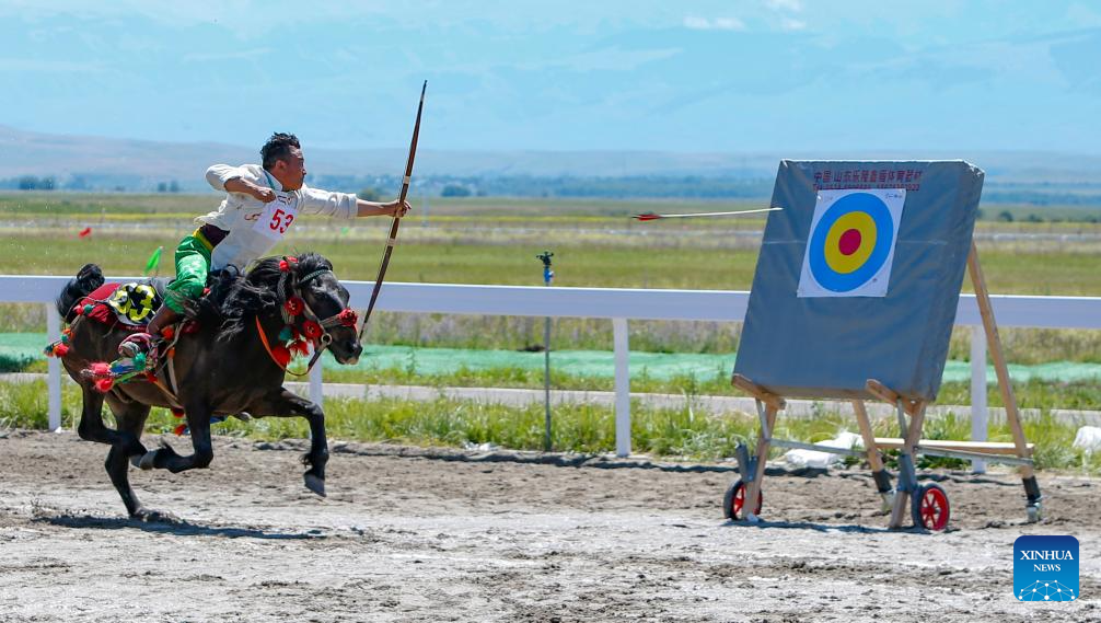 An athlete competes during the riding and archery match of the equestrian events at the 12th National Traditional Games of Ethnic Minorities of China in Zhaosu, northwest China's Xinjiang Uygur Autonomous Region, July 10, 2024. (Xinhua/Chen Shuo)