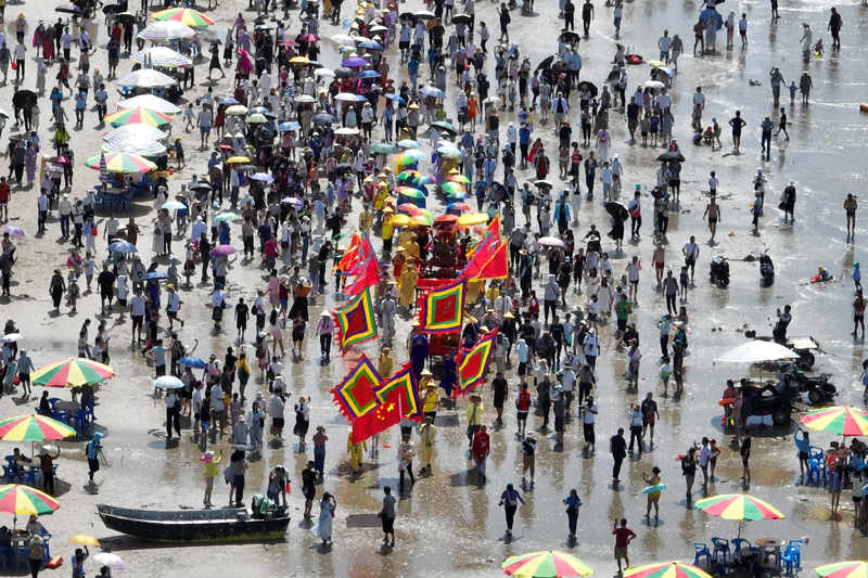 Colorful flags fluttered, and drums resounded on the morning of the day. The Jing people, dressed in traditional costumes, gathered at the seaside to welcome the “Sea God” back, praying for a bumper harvest, success and good health.