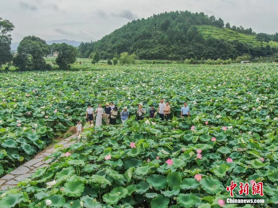 Aerial picture shows tourists going sightseeing at a lotus pond in Guangchang county, east China's Jiangxi Province. (Photo/Liu Lixin)
