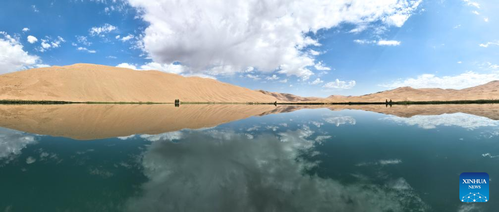 An aerial panoramic photo taken on July 31, 2024 shows a lake in the Badain Jaran Desert in north China's Inner Mongolia Autonomous Region. Located in the hyper-arid region of northwestern China, the Badain Jaran Desert is the country's third largest desert and second largest drifting desert.