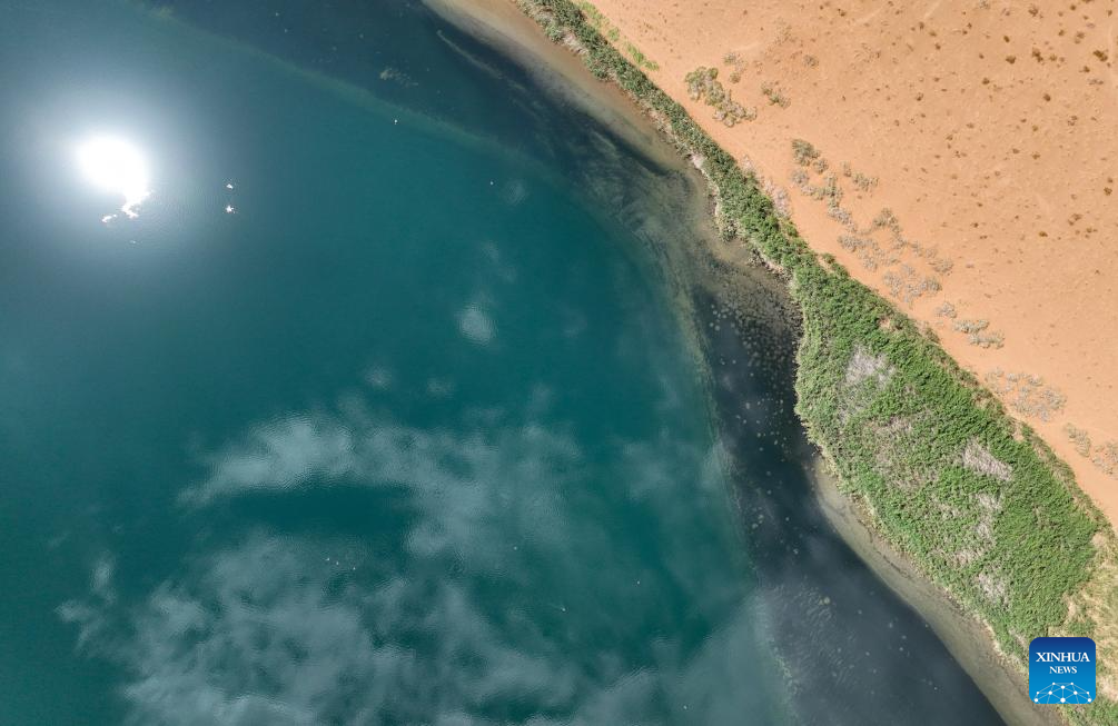 An aerial drone photo taken on July 31, 2024 shows a lake in the Badain Jaran Desert in north China's Inner Mongolia Autonomous Region. Located in the hyper-arid region of northwestern China, the Badain Jaran Desert is the country's third largest desert and second largest drifting desert.