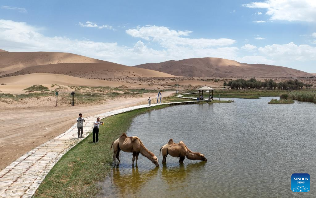 A drone photo taken on July 31, 2024 shows tourists taking photos of camels in the Badain Jaran Desert in north China's Inner Mongolia Autonomous Region. Located in the hyper-arid region of northwestern China, the Badain Jaran Desert is the country's third largest desert and second largest drifting desert.