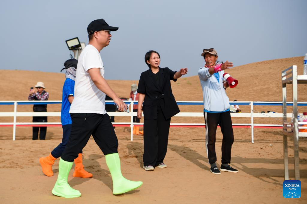Li Fang (R) talks with a villager, who runs a desert off-roading business, at the Yinkentala Desert scenic spot in Dalad Banner, north China's Inner Mongolia Autonomous Region, July 30, 2024.(Xinhua/Li Zhipeng)