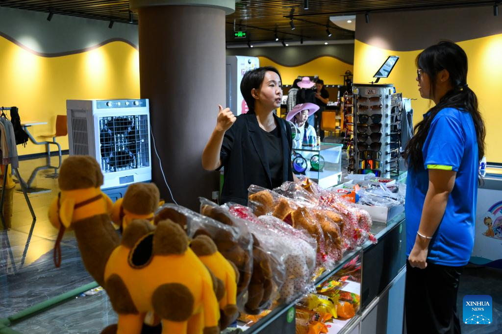 Li Fang (L) talks with a colleague at a souvenir store at the Yinkentala Desert scenic spot in Dalad Banner, north China's Inner Mongolia Autonomous Region, July 31, 2024.(Xinhua/Li Zhipeng)