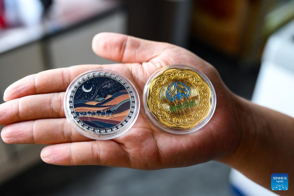 Li Fang shows cultural and creative products at the Yinkentala Desert scenic spot in Dalad Banner, north China's Inner Mongolia Autonomous Region, July 31, 2024.(Xinhua/Li Zhipeng)