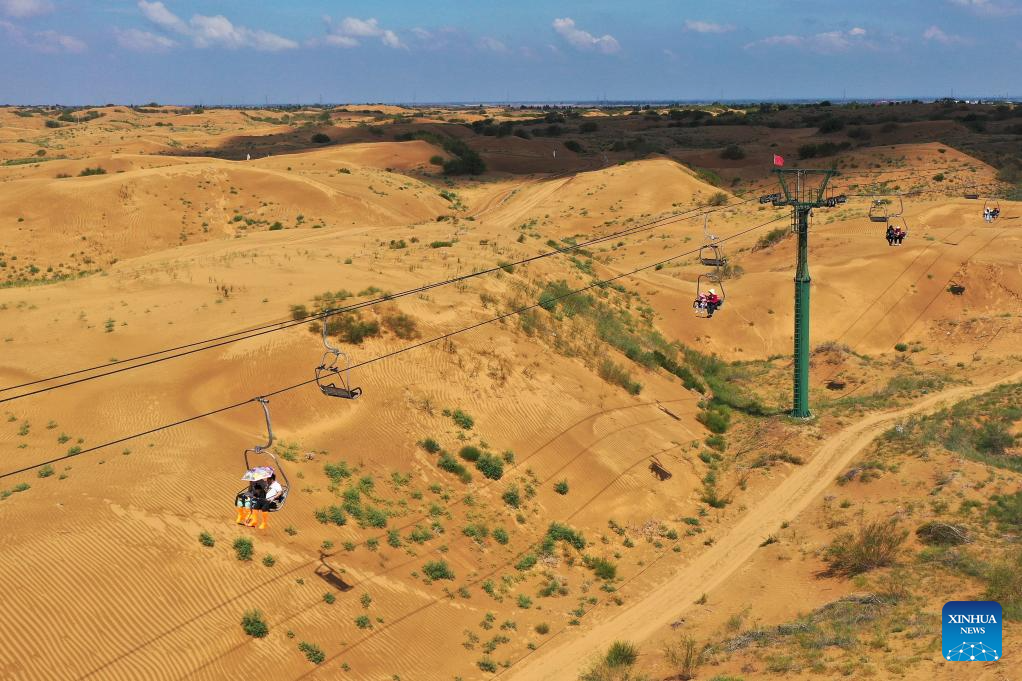 An aerial drone photo shows tourists taking cable cars at the Yinkentala Desert scenic spot in Dalad Banner, north China's Inner Mongolia Autonomous Region, July 31, 2024.(Xinhua/Li Zhipeng)