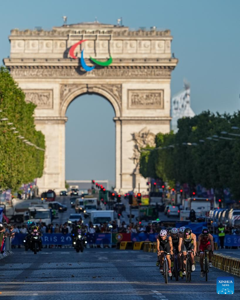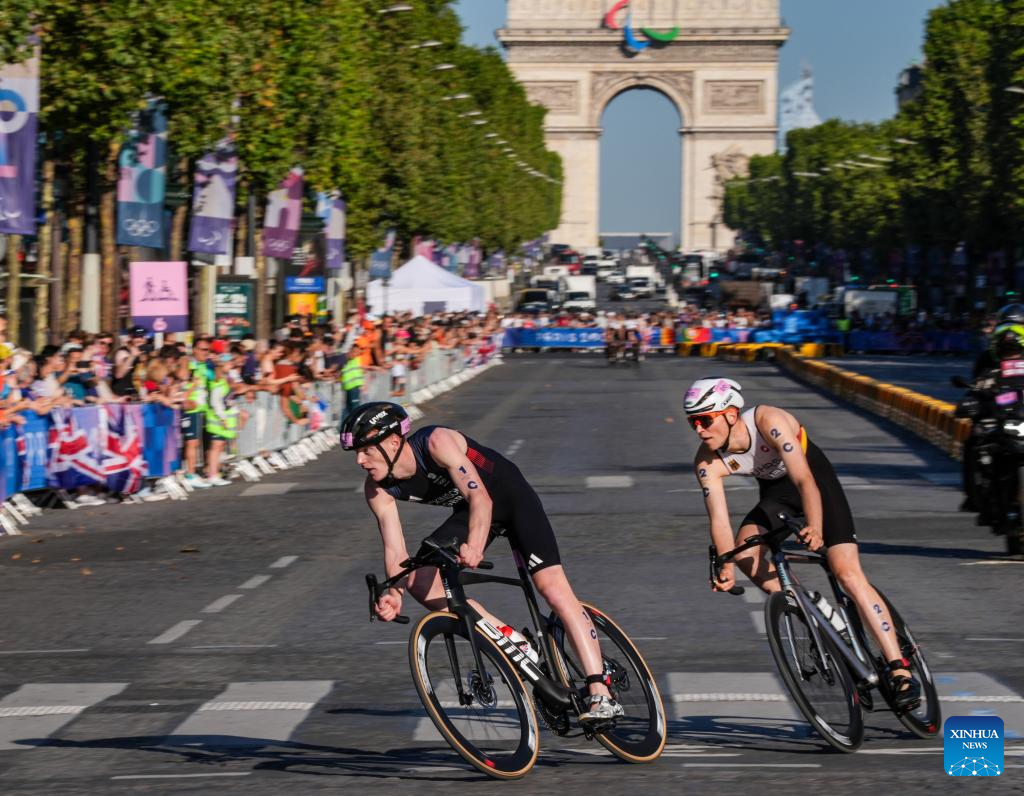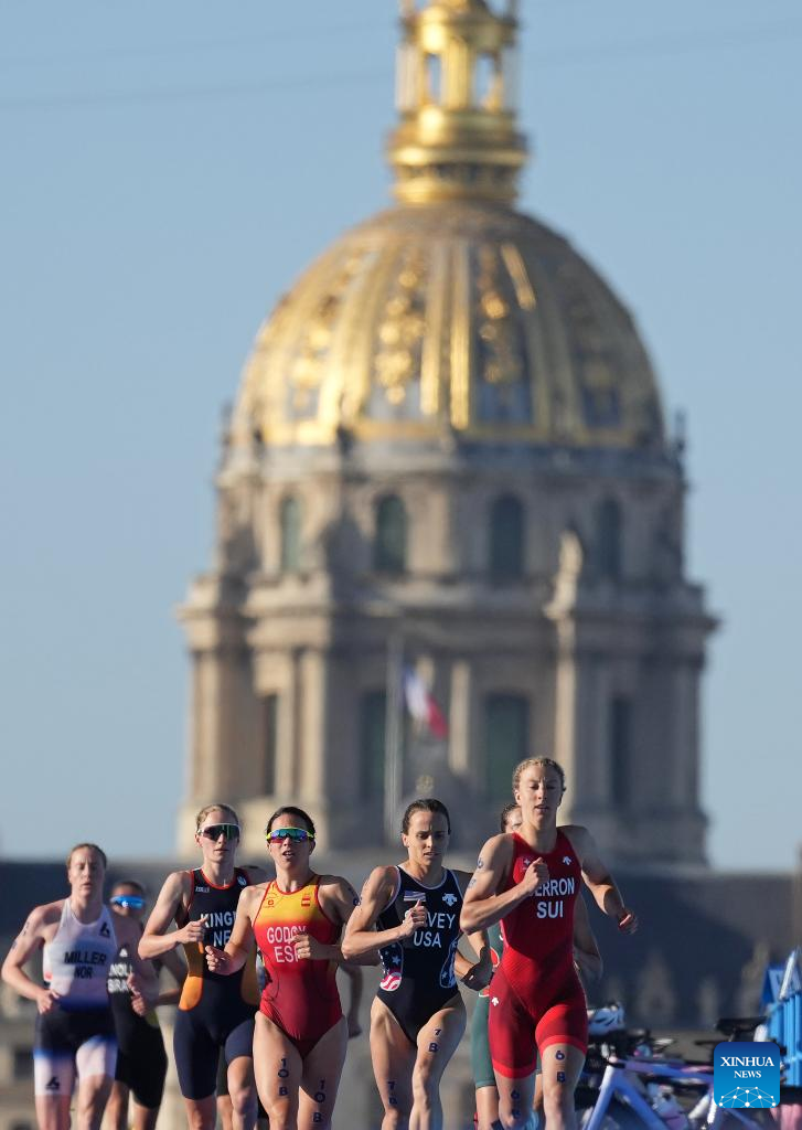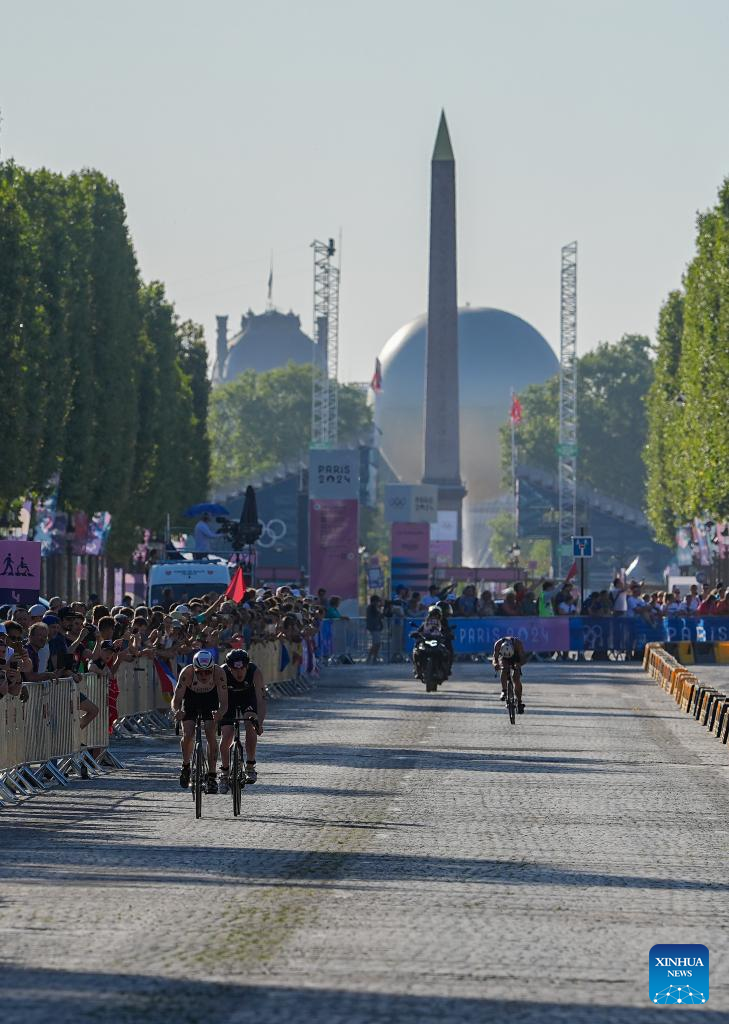 Athletes compete during the mixed relay triathlon at the Paris 2024 Olympic Games in Paris, France, on Aug. 5, 2024. (Xinhua/Wan Xiang)