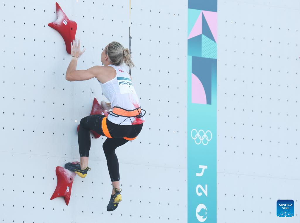 (240805) -- LE BOURGET, Aug. 5, 2024 (Xinhua) -- Aleksandra Miroslaw of Poland competes during the women's speed qualification seeding heats of sport climbing at the Paris 2024 Olympic Games in Le Bourget, France, on Aug. 5, 2024. (Xinhua/Gao Jing)