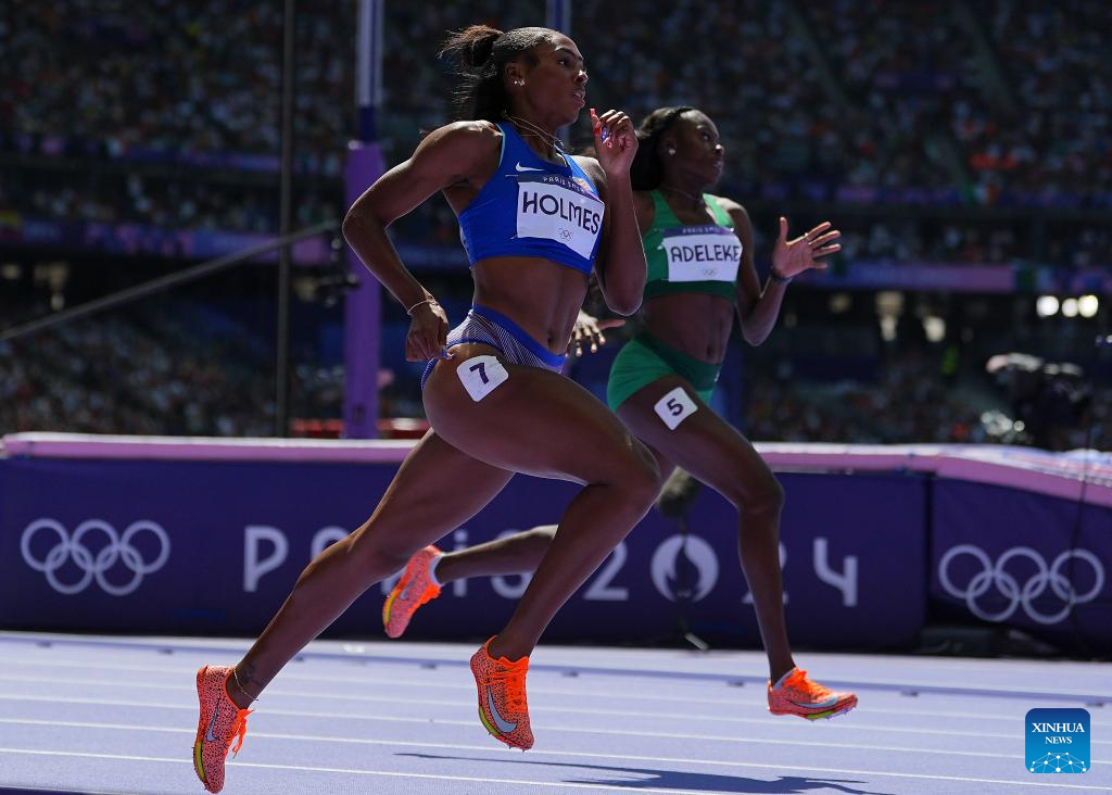 Rhasidat Adeleke of Ireland and Alexis Holmes (L) of the United States compete during the women's 400m round 1 of Athletics at the Paris 2024 Olympic Games in Paris, France, Aug. 5, 2024. (Xinhua/Xu Chang)