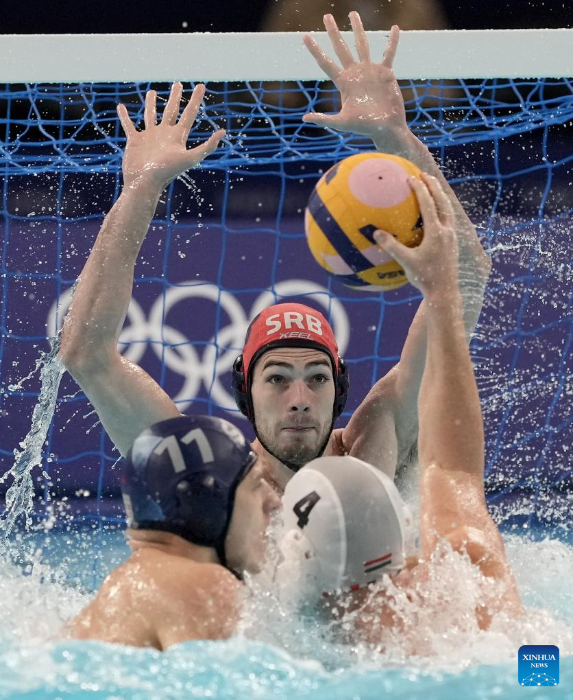 Goalkeeper Vladimir Misovic (C) of Serbia competes during the men's water polo preliminary round group B match between Hungary and Serbia at the Paris 2024 Olympic Games in Saint-Denis, France, Aug. 5, 2024. (Xinhua/Wang Yuguo)
