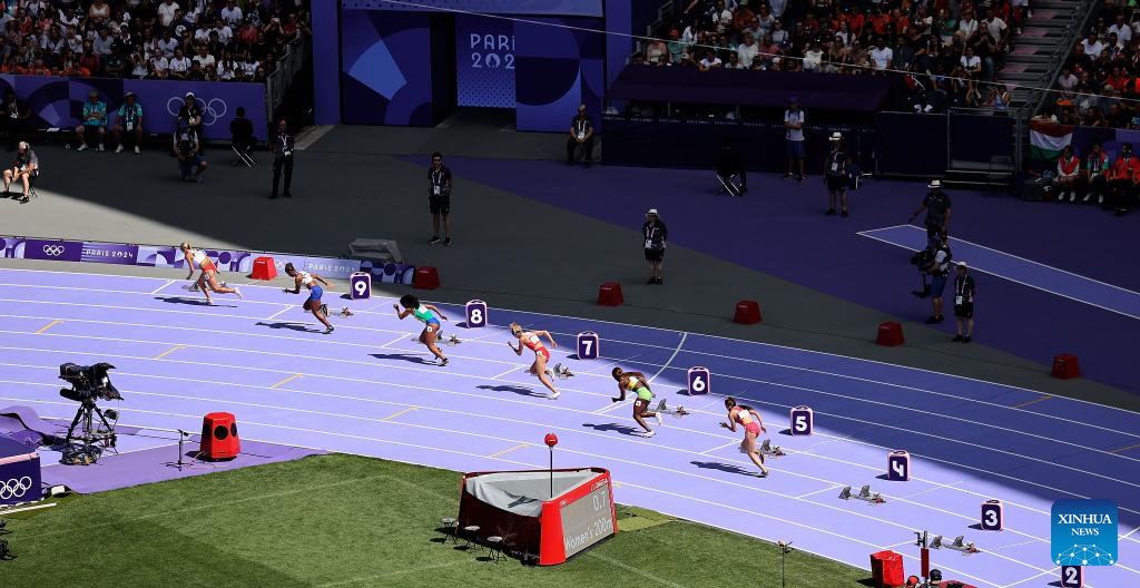 Athletes compete during the women's 200m repechage round of Athletics at the Paris 2024 Olympic Games in Paris, France, Aug. 5, 2024. (Xinhua/Li Gang)
