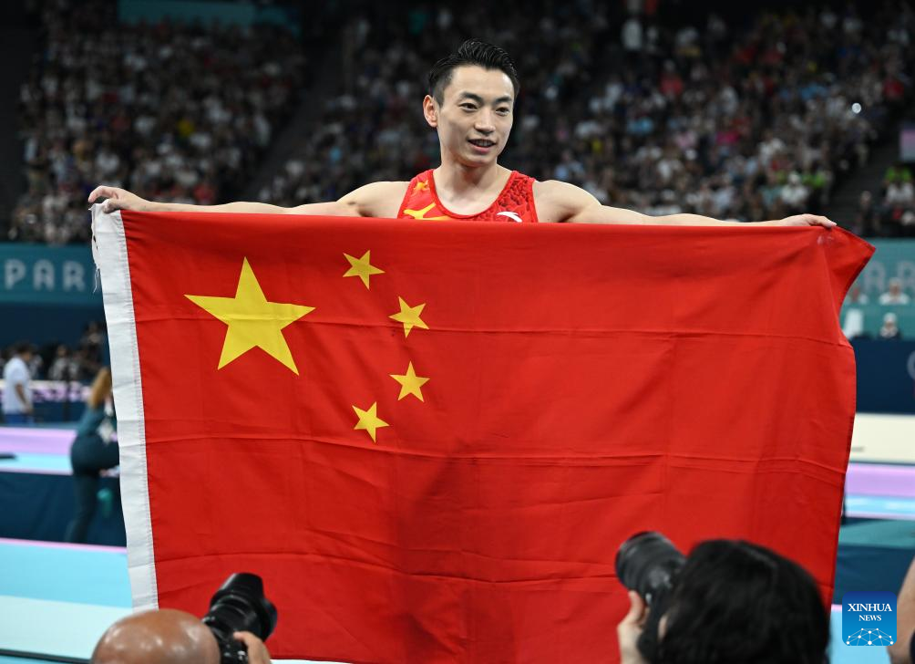 Zou Jingyuan of China celebrates after the men's parallel bars final of artistic gymnastics at the Paris 2024 Olympic Games in Paris, France, Aug. 5, 2024. (Xinhua/Li An)