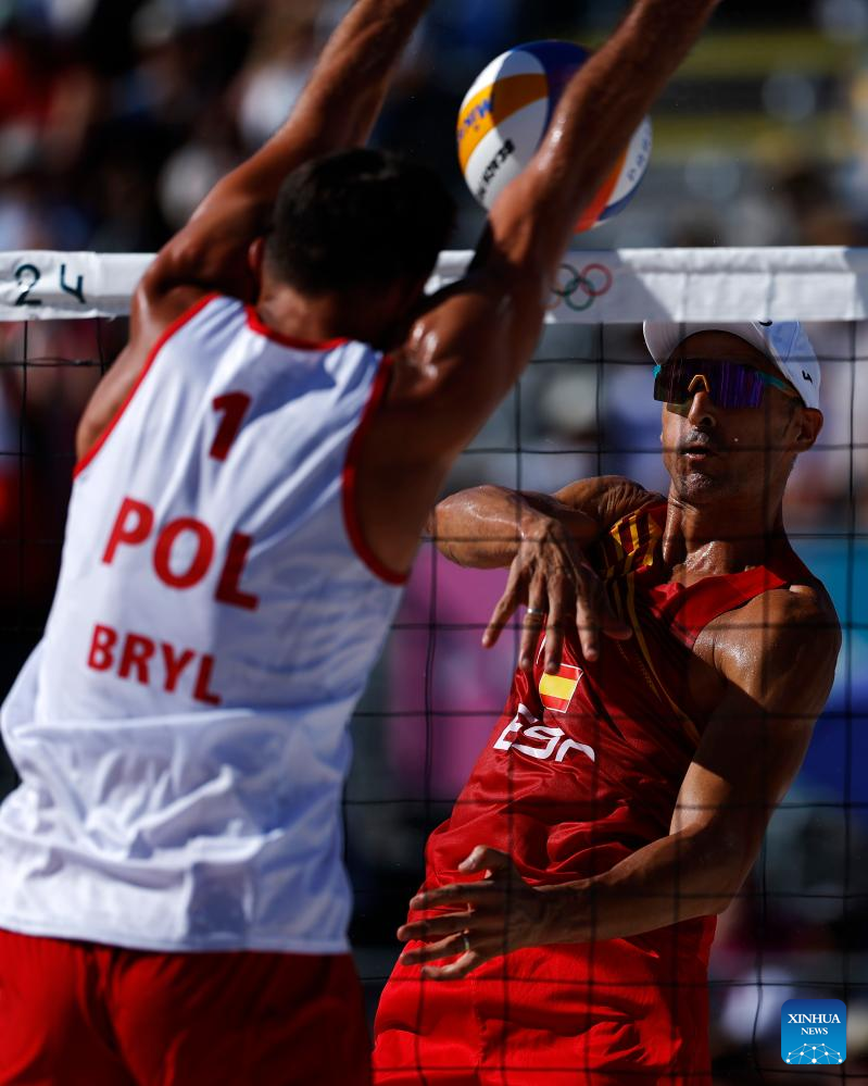 Pablo Herrera Allepuz (R) of Spain competes with Michal Bryl of Poland during the beach volleyball men's round of 16 match at the Paris 2024 Olympic Games in Paris, France, Aug. 5, 2024. (Xinhua/Fei Maohua)