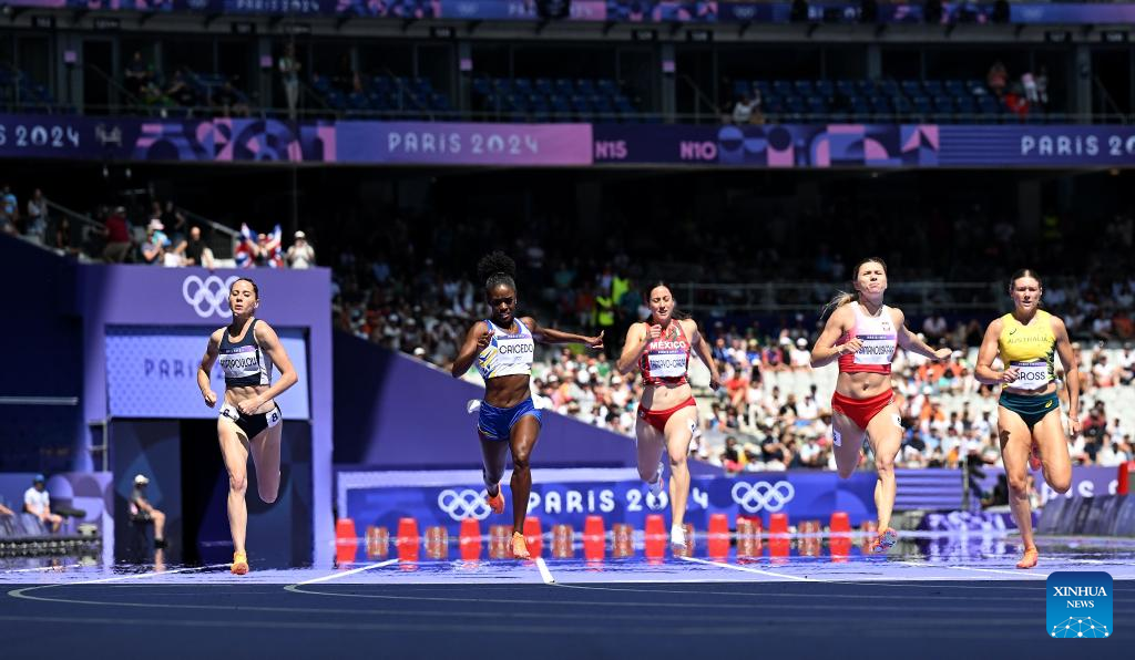 Krystsina Tsimanouskaya (2nd R) of Poland competes during the women's 200m repechage round of Athletics at the Paris 2024 Olympic Games in Paris, France, Aug. 5, 2024. (Xinhua/Lui Siu Wai)