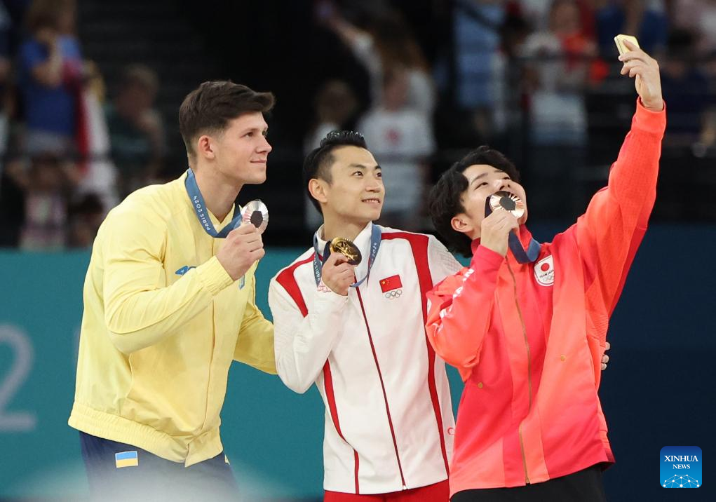 Gold medalist Zou Jingyuan (C) of China, silver medalist Illia Kovtun (L) of Ukraine and bronze medalist Oka Shinnosuke of Japan take selfies during the awarding ceremony after the men's parallel bars final of artistic gymnastics at the Paris 2024 Olympic Games in Paris, France, Aug. 5, 2024. (Xinhua/Lai Xiangdong)