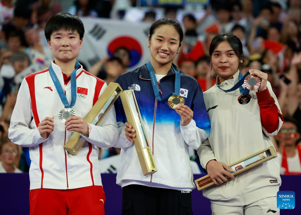 Gold medalist An Se Young (C) of South Korea, silver medalist He Bingjiao (L) of China and bronze medalist Gregoria Mariska Tunjung of Indonesia attend the awarding ceremony after the badminton women's singles gold medal match at the Paris 2024 Olympic Games in Paris, France, on Aug. 5, 2024. (Xinhua/Ren Zhenglai)