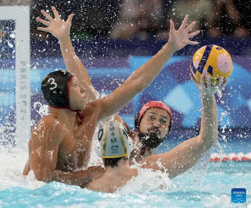 Watanabe Taiyo (L) of Japan competes during the men's water polo preliminary round group B match between Australia and Japan at the Paris 2024 Olympic Games in Saint-Denis, France, Aug. 5, 2024. (Xinhua/Wang Yuguo)