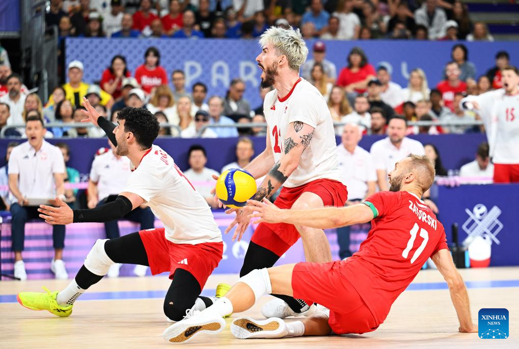 Tomasz Fornal (C) of team Poland competes during the men's quarterfinal of volleyball between Slovenia and Poland at the Paris 2024 Olympic Games in Paris, France, Aug. 5, 2024. (Xinhua/Liu Dawei)