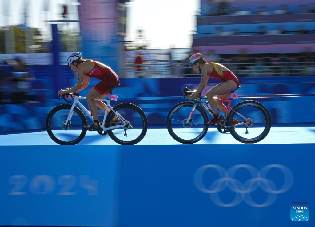 Cathia Schar (L) of Switzerland and Miriam Casillas Garcia of Spain competes during the mixed relay triathlon at the Paris 2024 Olympic Games in Paris, France, on Aug. 5, 2024. (Xinhua/Wan Xiang)