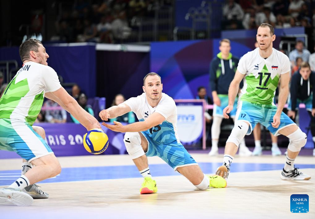 Jani Kovacic (C) of team Slovenia competes during the men's quarterfinal of volleyball between Slovenia and Poland at the Paris 2024 Olympic Games in Paris, France, Aug. 5, 2024. (Xinhua/Liu Dawei)
