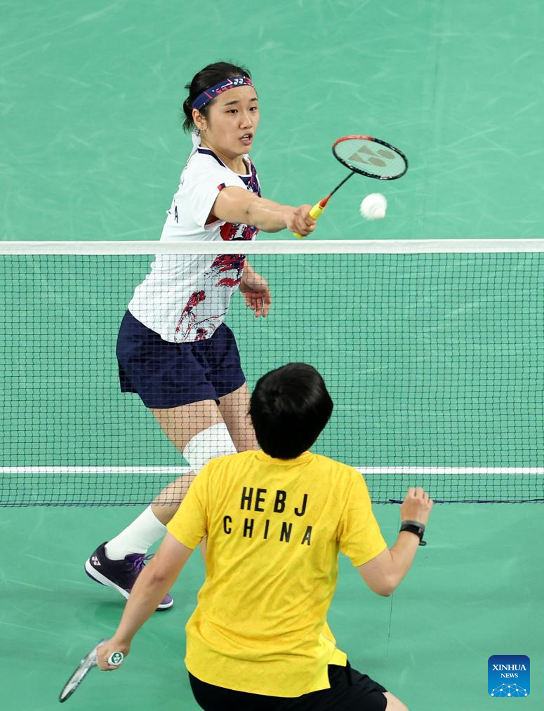 An Se Young (top) of South Korea competes during the badminton women's singles gold medal match between An Se Young of South Korea and He Bingjiao of China at the Paris 2024 Olympic Games in Paris, France, on Aug. 5, 2024. (Xinhua/Jia Haocheng)