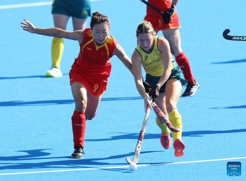 (240805) -- PARIS, Aug. 5, 2024 (Xinhua) -- Zou Meirong (C) of team China competes during the women's quarterfinal of hockey between Australia and China at the Paris 2024 Olympic Games in Colombes, northwest suburbs of Paris, France, Aug. 5, 2024. (Xinhua/Ren Pengfei)