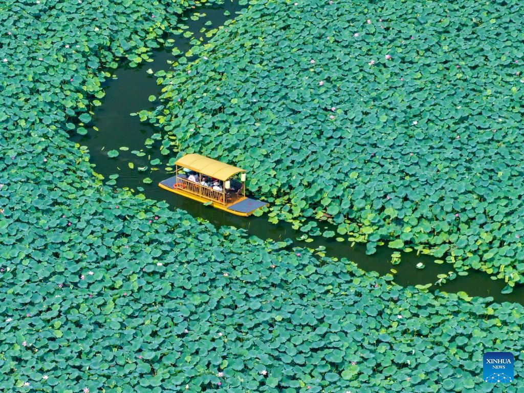 An aerial drone photo shows tourists sightseeing in a lotus pond scenic area in Xinghua, east China's Jiangsu Province, Aug. 5, 2024. (Photo by Zhou Shegen/Xinhua)
