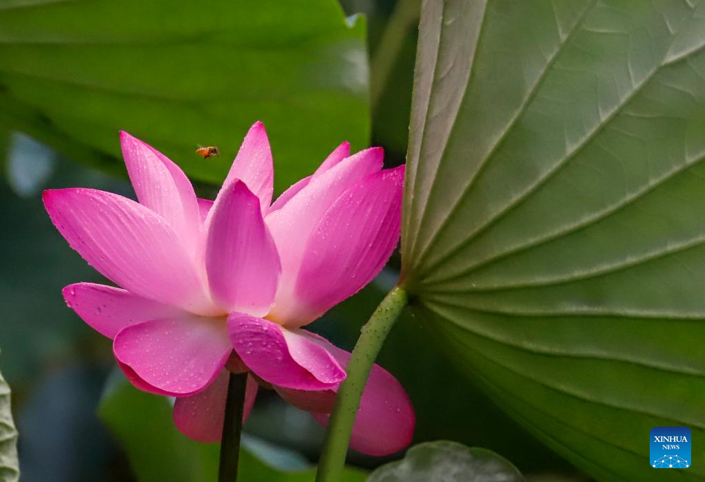 A bee hovers around a lotus in a pond in Shijiazhuang, north China's Hebei Province, Aug. 4, 2024. (Photo by Liang Zidong/Xinhua)