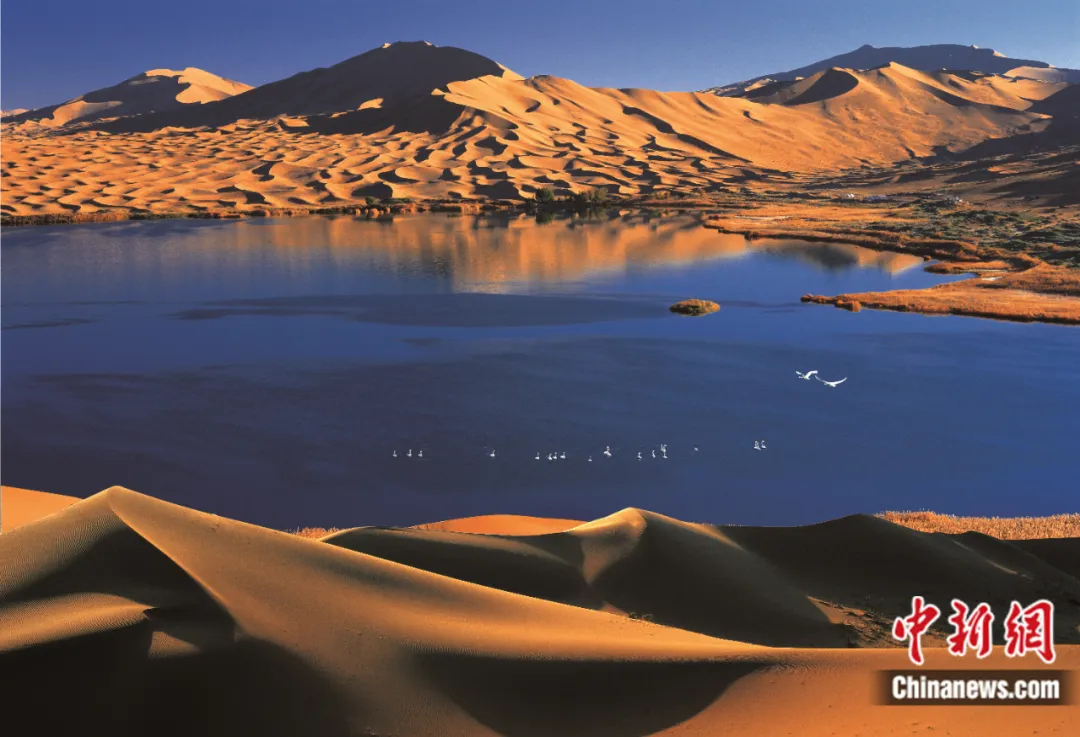 Birds hover freely over a lake in Badain Jaran Desert, Alxa Right Banner, Alxa League, north China's Inner Mongolia Autonomous Region. (Photo courtesy of the publicity department of the Communist Party of China Alxa Right Banner committee)