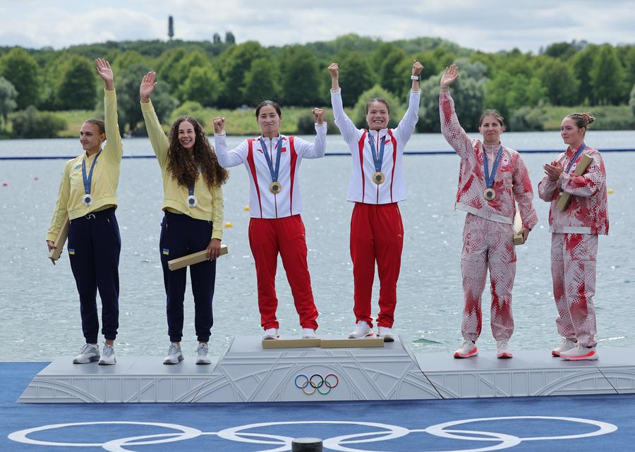 Gold medalists Xu Shixiao (R)/Sun Mengya of China attend the awarding ceremony after the women's canoe double 500m final of canoe sprint at the Paris 2024 Olympic Games in Vaires-sur-Marne, France, on Aug. 9, 2024. (Xinhua/Shen Bohan)