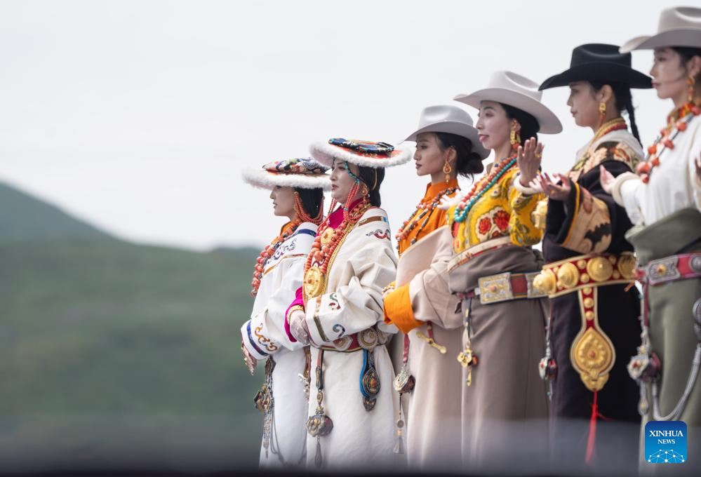 Locals present Tibetan costumes during a fashion show held at the opening ceremony of a nomadic cultural tourism season in Sertar County, southwest China's Sichuan Province, Aug. 10, 2024. (Xinhua/Jiang Hongjing)