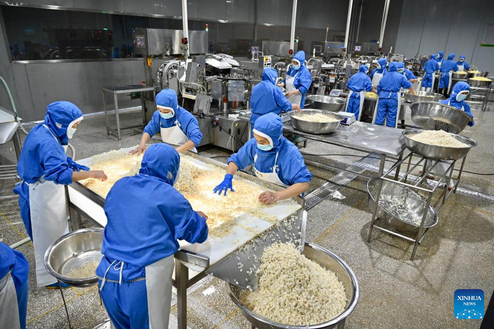 Staff members process food products made with bamboo shoots at a company in Sanming City, southeast China's Fujian Province, May 9, 2024. Sanming City has been exploring a new path of development that embraces green transformation to boost rural tourism including forest-based health services and other economic activities. Currently, forests cover 77.12 percent of the total area in the city. (Xinhua/Jiang Kehong)