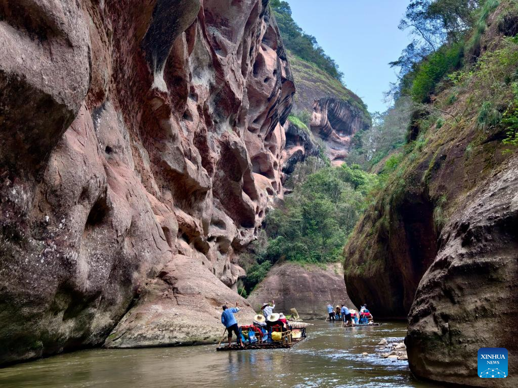 Tourists on bamboo rafts enjoy Danxia landform on the Shangqing stream in Taining County, Sanming City, southeast China's Fujian Province, Aug. 11, 2024. Sanming City has been exploring a new path of development that embraces green transformation to boost rural tourism including forest-based health services and other economic activities. Currently, forests cover 77.12 percent of the total area in the city. (Xinhua/Jiang Kehong)