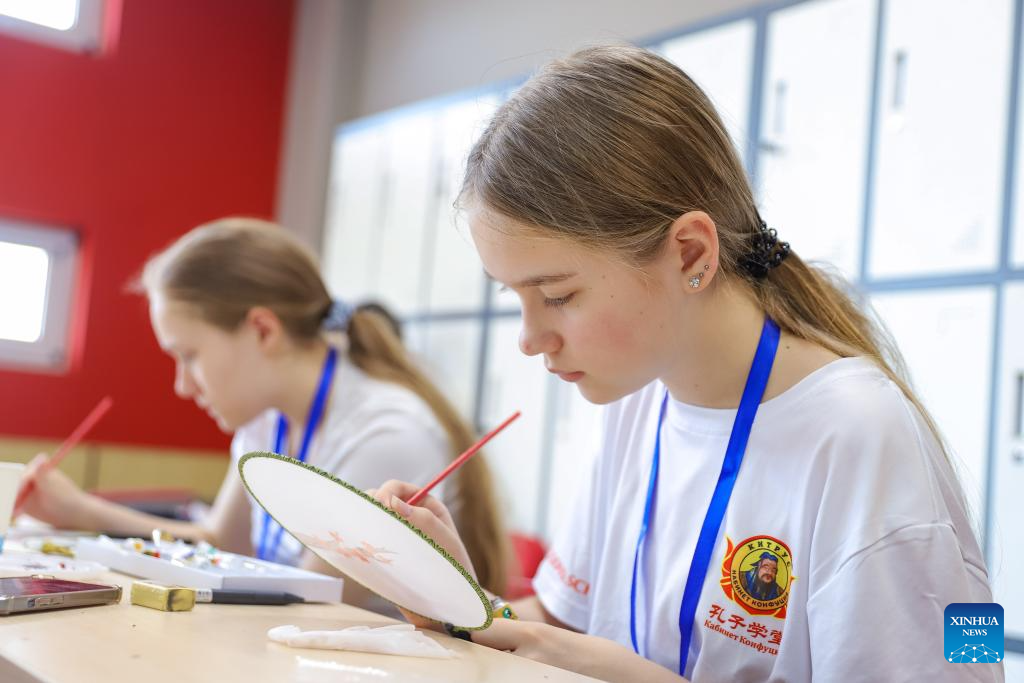 Russian students paint fans at Qingdao Hengxing University in Qingdao, east China's Shandong Province, Aug. 12, 2024.