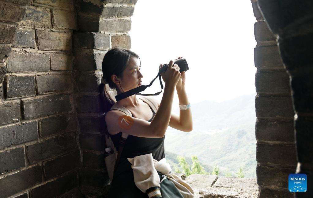 A participant of a cross-Strait journalism camp takes photos of the Mutianyu section of the Great Wall in Beijing, capital of China, Aug. 25, 2024. (Xinhua/Li Xin)