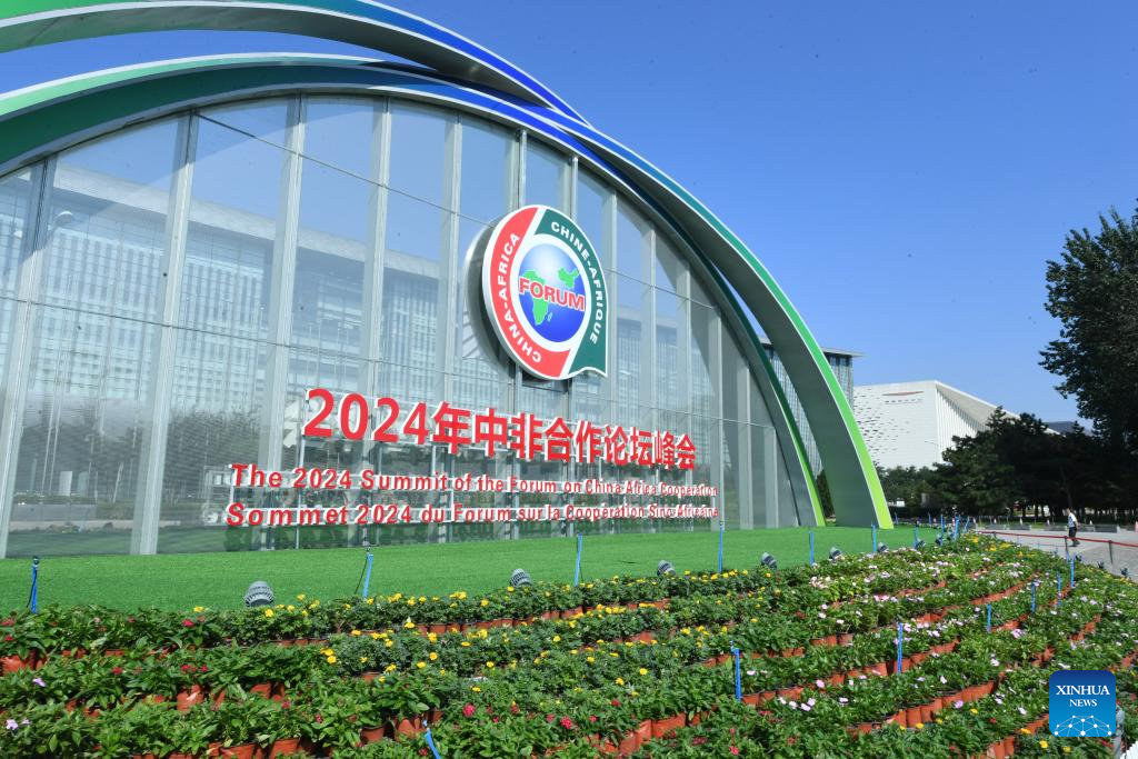 This photo taken on Aug. 29, 2024 shows the logo of the 2024 Summit of the Forum on China-Africa Cooperation (FOCAC) near China National Convention Center in Beijing, capital of China. The FOCAC summit is scheduled to take place in Beijing from Sept. 4 to 6. (Xinhua/Ren Chao)