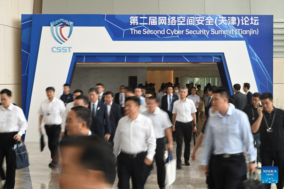 This photo shows the second Cyber Security Summit (Tianjin) (CSST) in north China's Tianjin municipality, Sept. 4, 2024. The second CSST is held here under the theme "Jointly Building Cyber Security and Governing Cyberspace." (Xinhua/Sun Fanyue)