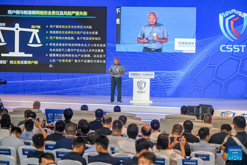 Wu Jiangxing, an academician of the Chinese Academy of Engineering, speaks during the second Cyber Security Summit (Tianjin) (CSST) in north China's Tianjin municipality, Sept. 4, 2024. The second CSST is held here under the theme "Jointly Building Cyber Security and Governing Cyberspace." (Xinhua/Sun Fanyue)