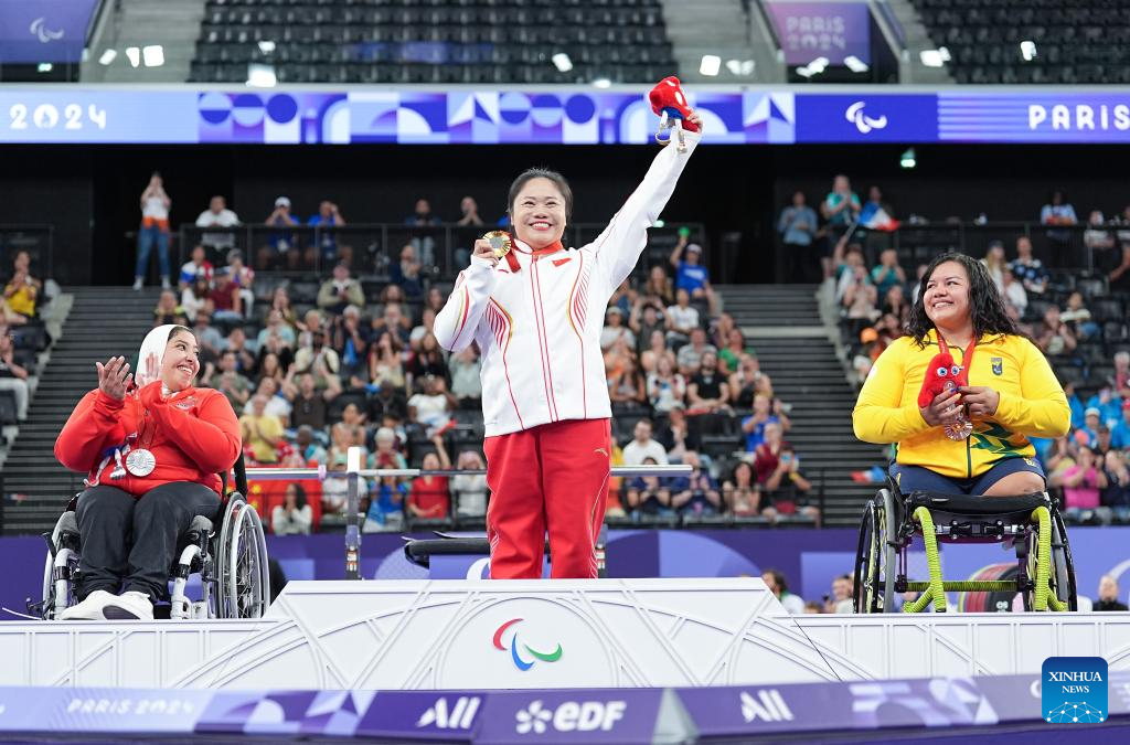 Tan Yujiao of China celebrates after the para powerlifting women's up to 67kg final at the Paris 2024 Paralympic Games in Paris, France, Sept. 6, 2024. (Xinhua/Lian Yi)