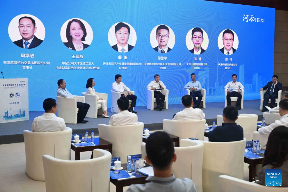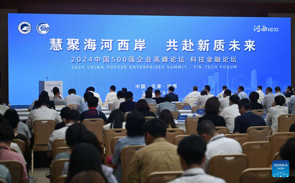 This photo taken on Sept. 10, 2024 shows the fin-tech forum of 2024 China Top 500 Enterprises Summit in north China's Tianjin. The two-day 2024 China Top 500 Enterprises Summit kicked off here Tuesday, attracting more than 2,000 entrepreneurs, experts, scholars and industry-related guests. (Xinhua/Sun Fanyue)