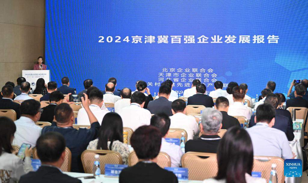 A report on the top 100 enterprises in the Beijing-Tianjin-Hebei region is released during the 2024 China Top 500 Enterprises Summit in north China's Tianjin, Sept. 10, 2024. The two-day 2024 China Top 500 Enterprises Summit kicked off here Tuesday, attracting more than 2,000 entrepreneurs, experts, scholars and industry-related guests. (Xinhua/Sun Fanyue)