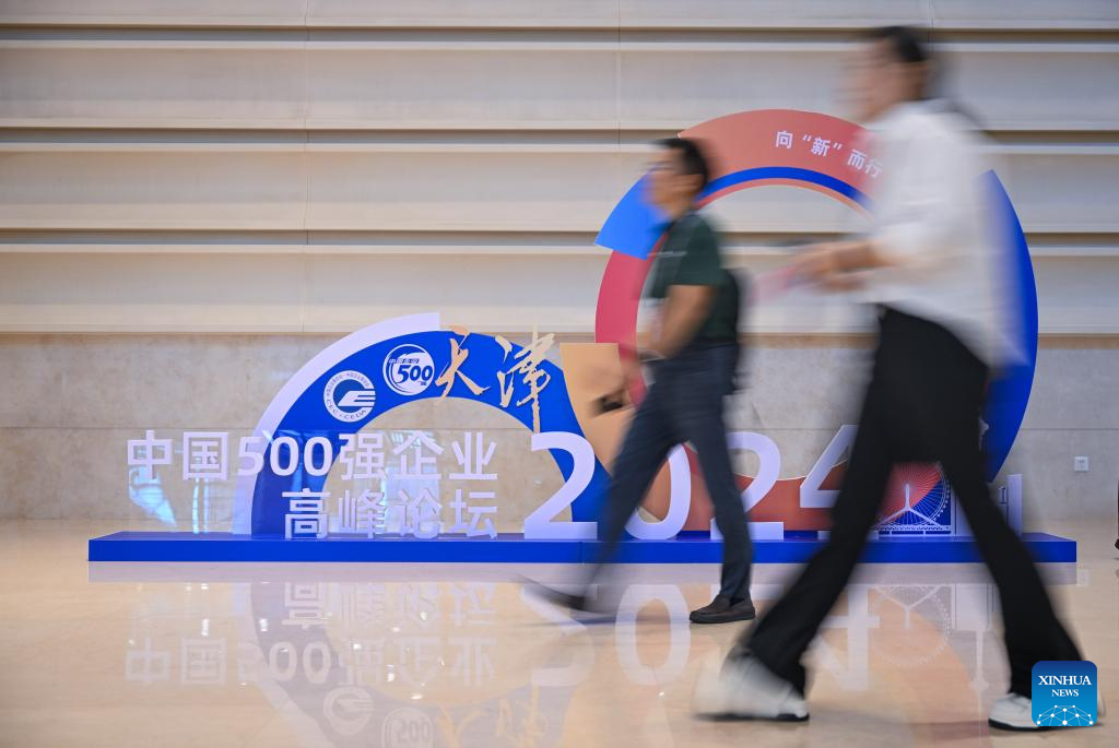 Attendees walk into the venue of the 2024 China Top 500 Enterprises Summit in north China's Tianjin, Sept. 10, 2024. The two-day 2024 China Top 500 Enterprises Summit kicked off here Tuesday, attracting more than 2,000 entrepreneurs, experts, scholars and industry-related guests. (Xinhua/Sun Fanyue)