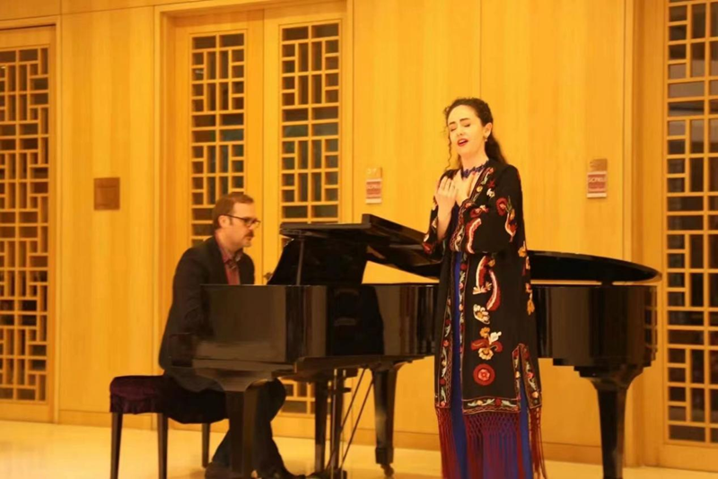 Photo shows Phoebe Haines with her supervisor, Professor Blake Stevens, performing "The Conception and Interpretation of Chinese Art Songs" concert at Peking University's Stanford Center, April 2023. (Photo provided by Phoebe Haines)