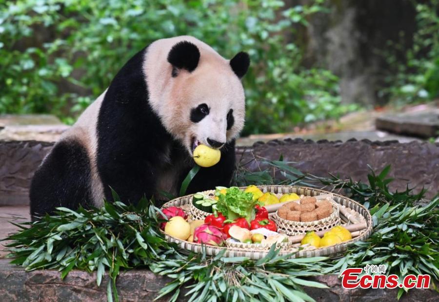 A giant panda enjoys a special birthday cake during a group party at the Bifengxia Giant Panda Base in Ya'an, southwest China's Sichuan Province, Sept. 13, 2024. (Photo: China News Service/An Yuan)