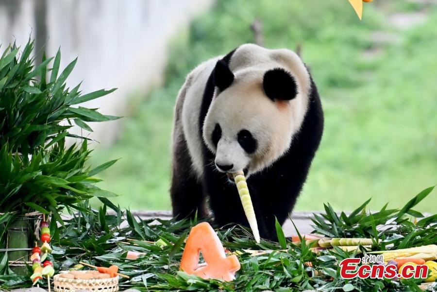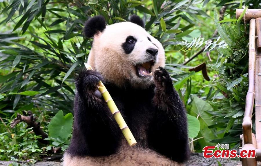 A giant panda enjoys bamboo shoots during a group birthday party at the Bifengxia Giant Panda Base in Ya'an, southwest China's Sichuan Province, Sept. 13, 2024. (Photo: China News Service/An Yuan)