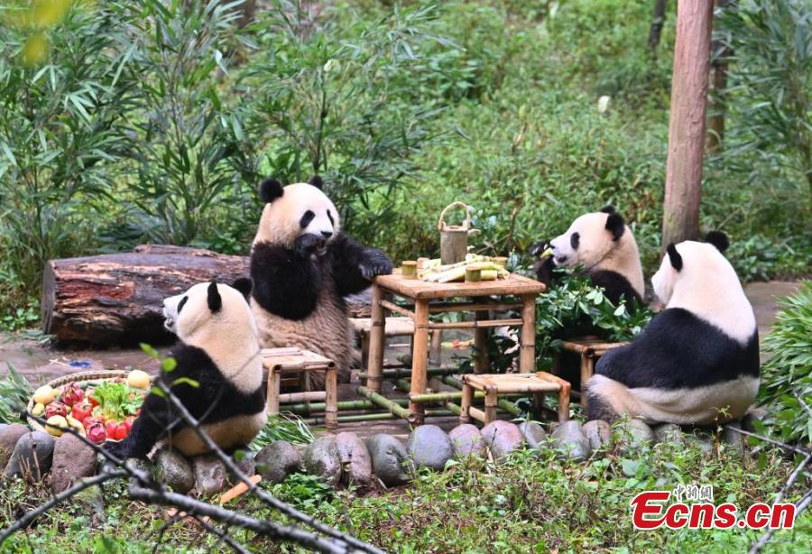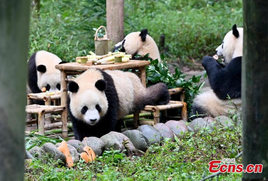 Giant pandas enjoy a special birthday cake during a group party at the Bifengxia Giant Panda Base in Ya'an, southwest China's Sichuan Province, Sept. 13, 2024. (Photo: China News Service/An Yuan)