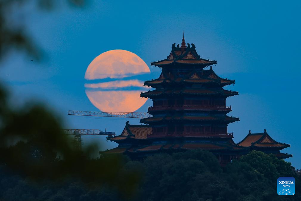 The moon rises above Huzhou City, east China's Zhejiang Province, Sept. 17, 2024. The Mid-Autumn Festival in China, which is celebrated annually on the 15th day of the eighth month in the Chinese lunar calendar, falls on Sept. 17 this year. As one of China's most important traditional holidays, it is a joyous time when families come together, appreciate the full moon and share moon cakes, a traditional pastry, to mark the harvest season. (Photo by Yi Fan/Xinhua)
